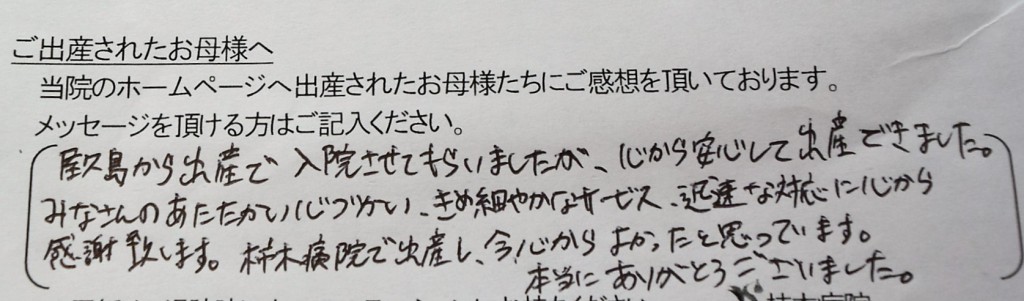屋久島から出産で入院させてもらいましたが、心から安心して出産できました。みなさんのあたたかい心づかい、きめ細やかなサービス、迅速な対応に心から感謝致します。<br />