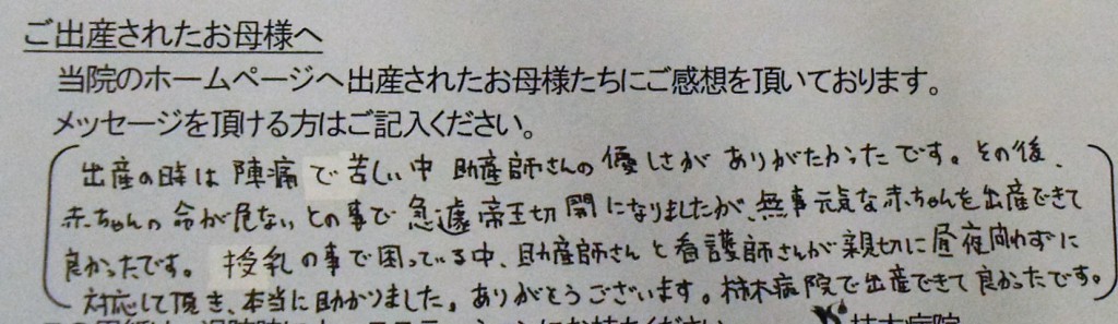 出産の時は陣痛で苦しい中助産師さんの優しさがありがたかったです。その後、赤ちゃんの命が危ないとの事で急遽帝王切開になりましたが、無事元気な赤ちゃんを出産できて良かったです。<br />