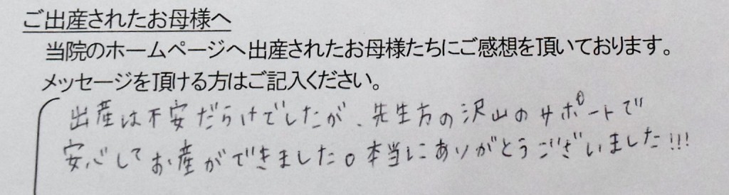 出産は不安だらけでしたが、先生方の沢山のサポートで安心してお産ができました。本当にありがとうございました!!