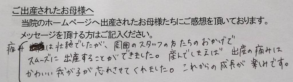 痛みは壮絶でしたが、周囲のスタッフの方たちのおかげでスムーズに出産することができました。産んでしまえば出産の痛みはかわいい我が子が忘れさせてくれました。これからの成長が楽しみです。