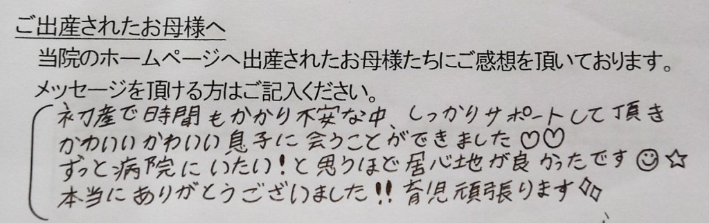 初産で時間もかかり不安な中、しっかりサポートして頂き、かわいいかわいい息子に会うことができました♡♡<br />