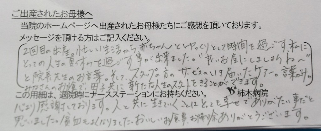 2回目の出産。忙しい生活から赤ちゃんとゆっくりとして時間を過ごす私にとっての人生の夏休みを過ごす事が出来ました。“良いお産にしましょうね~”と院長先生のお言葉。そして、スタッフの方のサービスのいき届いたケア。言葉がけ。みなさんのお陰で、母子共に新たな人生のスタートをきることができます。<br />