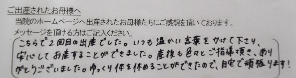 こちらで2回目の出産でした。いつも温かい言葉をかけて下さり、安心してお産することができました。産後も色々とご指導頂き、ありがとうございました。<br />