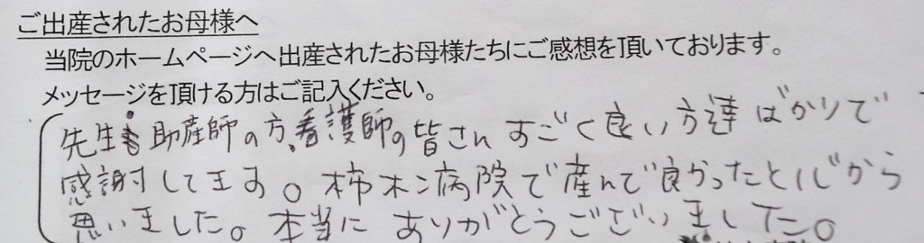 先生、助産師の方、看護師の皆さんすごく良い方達ばかりで感謝してます。柿木病院で産んで良かったと心から思いました。本当にありがとうございました。