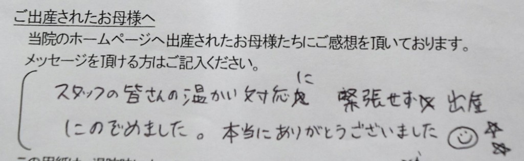 スタッフの皆さんの温かい対応に緊張せず出産にのぞめました。本当にありがとうございました☻★