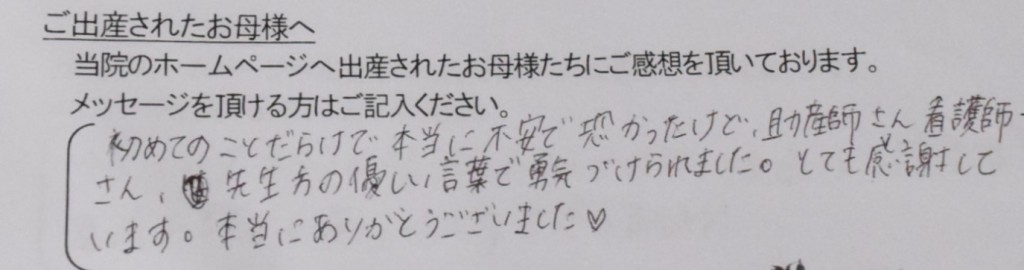 初めてのことだらけで本当に不安で恐かったけど、助産師さん看護師さん、先生方の優しい言葉で勇気づけられました。とても感謝しています。<br />