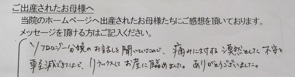ソフロロジー分娩のお話を聞いていたので、痛みに対する漠然とした不安を軽減できた上で、リラックスしてお産に臨めました。<br />
