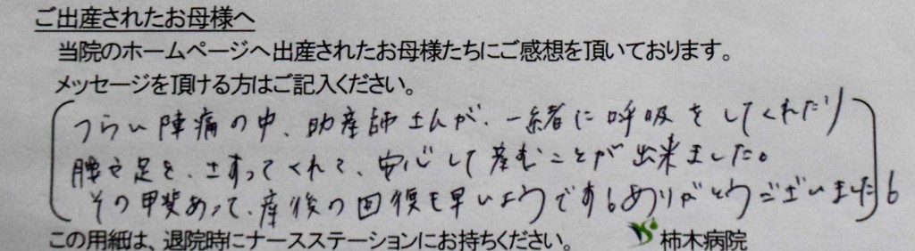 つらい陣痛の中、助産師さんが一緒に呼吸してくれたり、腰や足をさすってくれて安心して産むことが出来ました。<br />