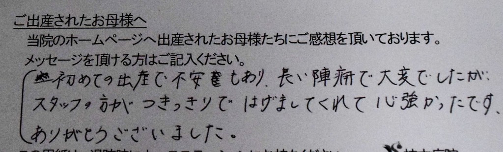 初めての出産で不安もあり、長い陣痛で大変でしたが、スタッフの方がつきっきりで励ましてくれて心強かったです。<br />