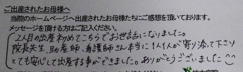 院長先生、助産師、看護師さん本当に1人1人が寄り添って下さり、とても安心して出産する事ができました。ありがとうございました☻
