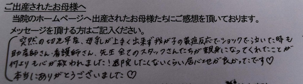 突然の切迫早産、母乳が上手く出来ず我が子の黄疸反応でショックで泣いた時も助産師さん、看護師さん、先生全てのスタッフさんたちが親身になってくれたことが<br />
