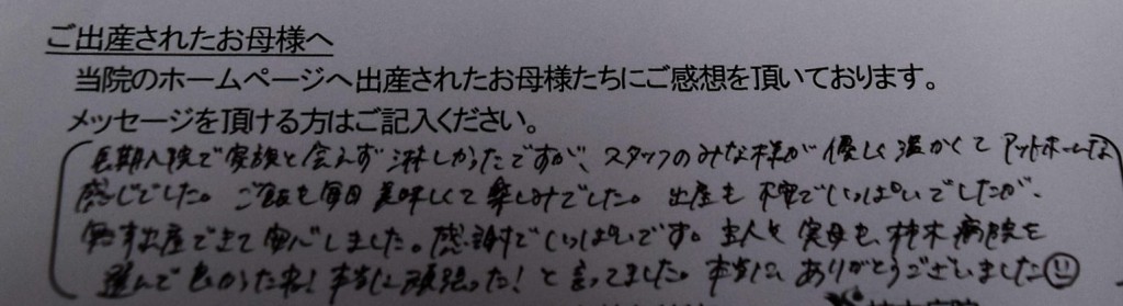 長期入院で家族と会えず淋しかったですが、スタッフのみな様が優しく温かくてアットホームな感じでした。ご飯も毎日美味しくて楽しみでした。出産も不安でいっぱいでしたが、無事出産できて安心しました。<br />