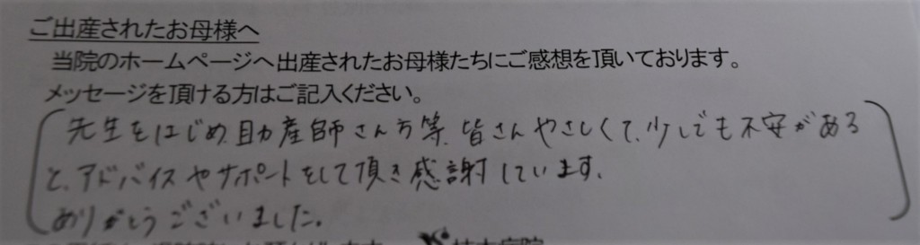先生をはじめ助産師さん方等、皆さんやさしくて少しでも不安があると、アドバイスやサポートをして頂き感謝しています。ありがとうございました。