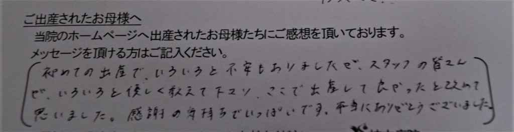 初めての出産で、いろいろと不安もありましたが、スタッフの皆さんが、いろいろと優しく教えて下さり、ここで出産して良かったと改めて思いました。感謝の気持ちでいっぱいです。本当にありがとうございました。