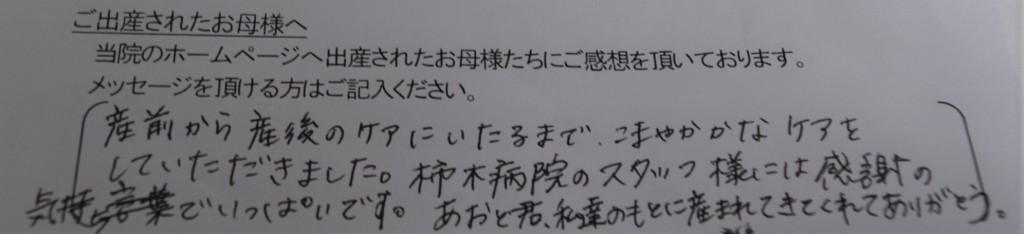 産前から産後のケアにいたるまで、こまやかなケアをしていただきました。柿木病院のスタッフ様には感謝の気持ちでいっぱいです。<br />
