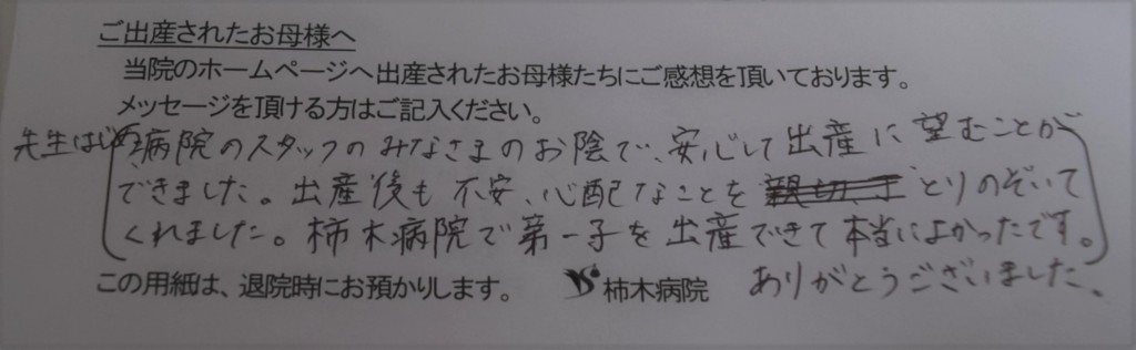 先生はじめ病院のスタッフのみなさまのお陰で、安心して出産に望むことができました。出産後も不安、心配なことをとりのぞいてくれました。柿木病院で第一子を出産できて本当によかったです。ありがとうございました。