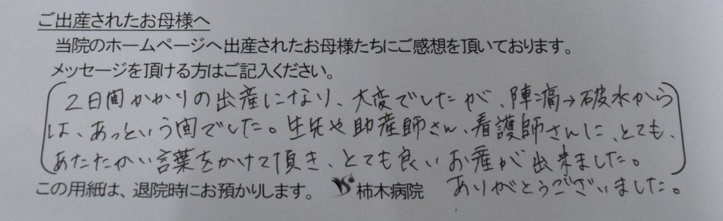 先生や助産師さん、看護師さんにとてもあたたかい言葉をかけて頂き、とても良いお産ができました。ありがとうございました。