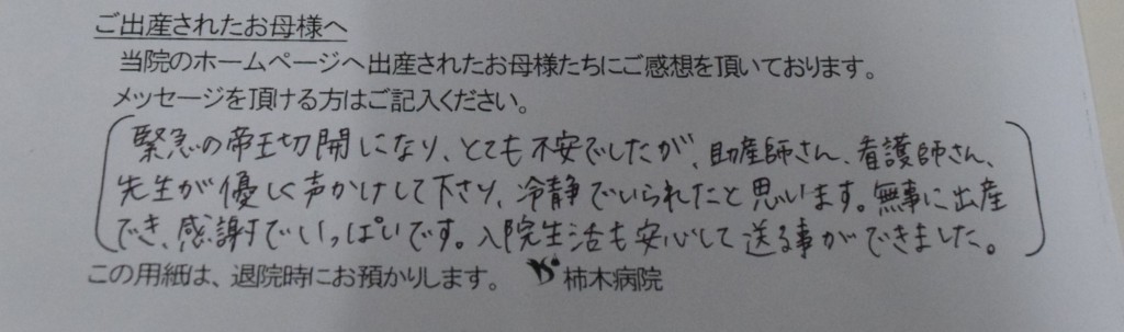 緊急の帝王切開になりとても不安でしたが、助産師さん、看護師さん、先生が優しく声かけして下さり、冷静でいられたと思います。<br />
