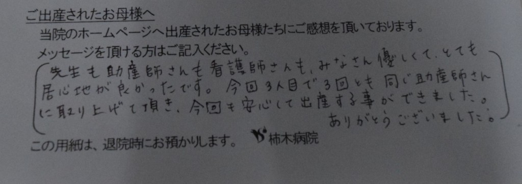 先生も助産師さんも看護師さんもみなさん優しくて、とても居心地が良かったです。今回3人目で3回とも同じ助産師さんに取り上げて頂き、今回も安心して出産する事ができました。ありがとうございました。