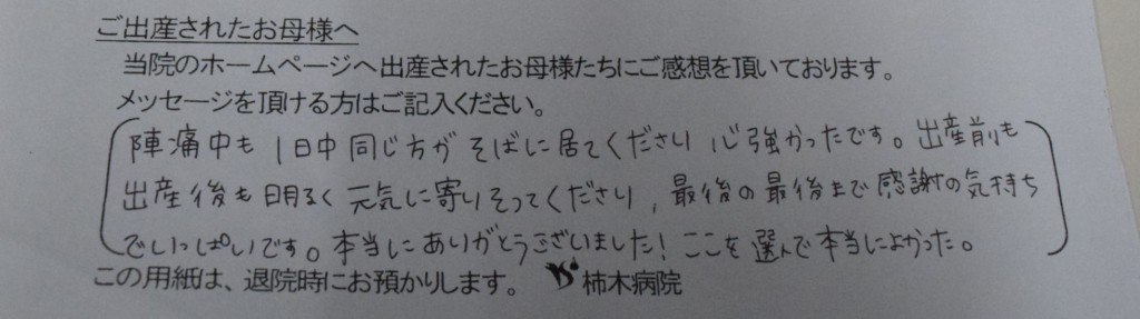 陣痛中も1日中同じ方がそばに居て下さり、心強かったです。<br />