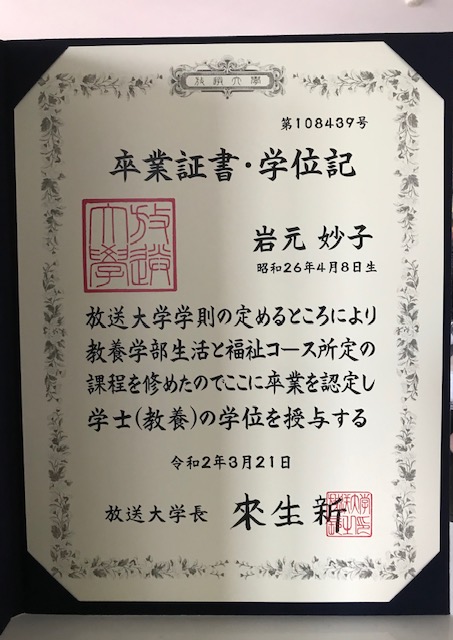私は今年の3月に放送大学課程124単位を修得でき、念願の大学卒業証書を手にすることが出来ました。(コロナウイルス感染の影響で卒業式が中止になり残念でしたが・・・?)