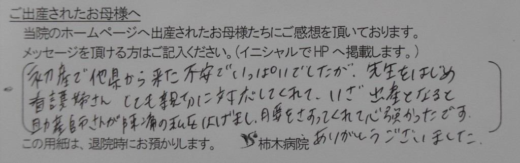 初産で他県から来た不安でいっぱいでしたが、先生をはじめ看護師さん とても親切に対応してくれて、いざ出産となると助産師さんが陣痛の私をはげまし、腰をさすってくれて心強かったです。ありがとうございました。