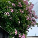 毎年春になると垣根に咲き誇るピンクのツル薔薇。