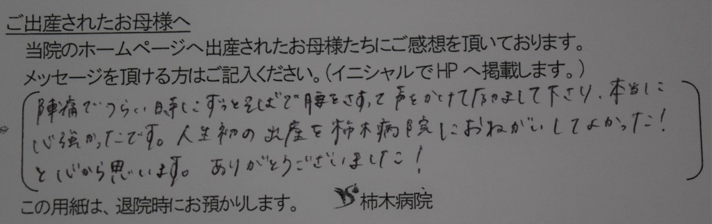 陣痛でつらい時にずっとそばで腰をさすって声をかけて励まして下さり、本当に心強かったです。人生初の出産を柿木病院におねがいしてよかった!と心から思います。ありがとうございました!
