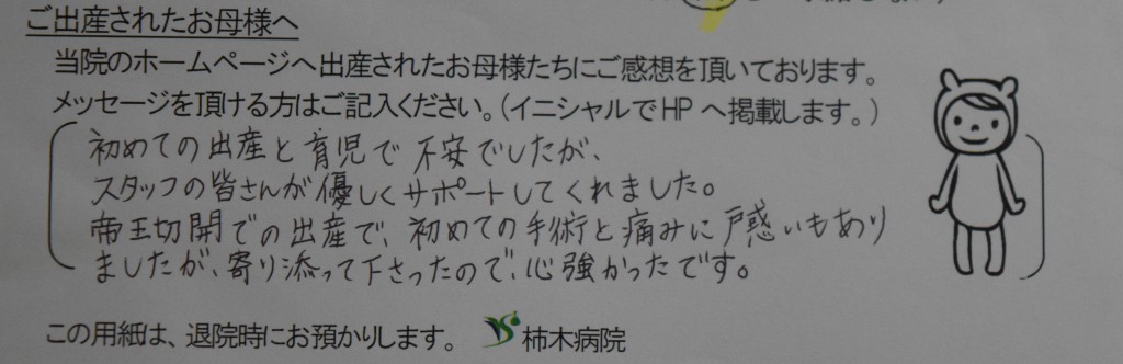 初めての出産と育児で不安でしたが、スタッフの皆さんが優しくサポートしてくれました。帝王切開での出産で、初めての手術と痛みに戸惑いもありましたが、寄り添って下さったので、心強かったです。