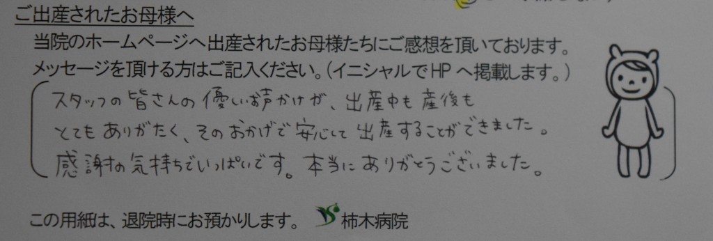スタッフの皆さんの優しい声かけが、出産中も産後もとてもありがたく、そのおかげで安心して出産することができました。感謝の気持ちでいっぱいです。本当にありがとうございました。