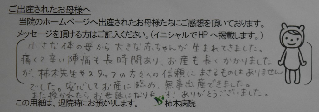 痛くて辛い陣痛も長時間あり、お産も長くかかりましたが、柿木先生やスタッフの方々への信頼にまさるものはありませんでした。安心してお産に臨め、無事出産できました。<br />