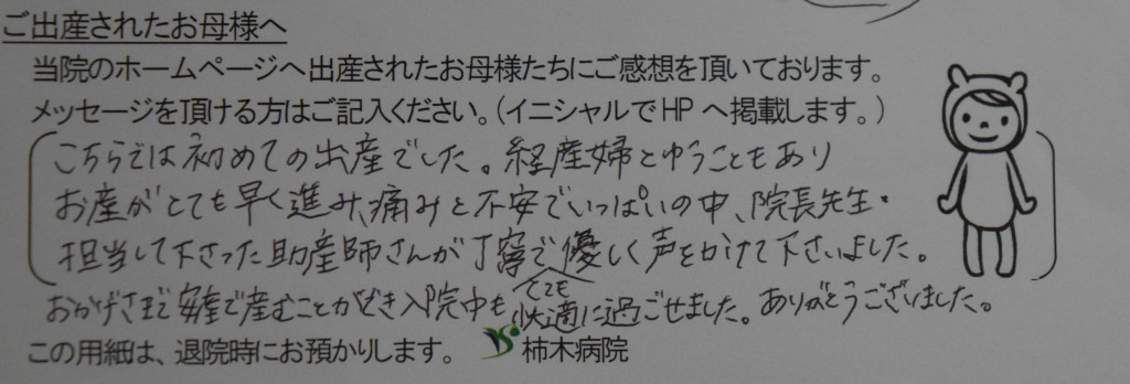 おかげさまで安産で産むことができ入院中も快適に過ごせました。ありがとうございました。