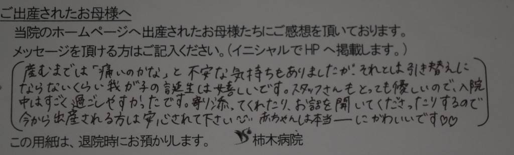 産むまでは「痛いのかな」と不安な気持ちもありましたが、それとは引き換えにならないくらい我が子の誕生は嬉しいです。スタッフさんもとっても優しいので、入院中はすごく過ごしやすかったです。寄り添ってくれたり、お話を聞いて下さったりするので今から出産される方は安心されて下さい☻赤ちゃんは本当ーーーに可愛いです♡