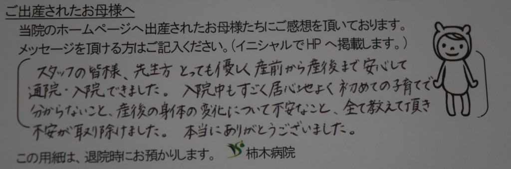 スタッフの皆様、先生方、とっても優しく産前から産後まで安心して通院・入院できました。入院中もすごく居心地よく初めての子育てで分からないこと、産後の身体の変化について不安なこと、全て教えて頂き不安が取り除けました。本当にありがとうございました。