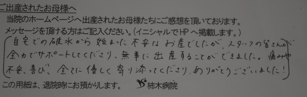 自宅での破水から始まった不安なお産でしたが、スタッフの皆さんが全力でサポートしてくださり、無事に出産することができました。痛みや不安、喜び、全てに優しく寄り添ってくださり、ありがとうございました。