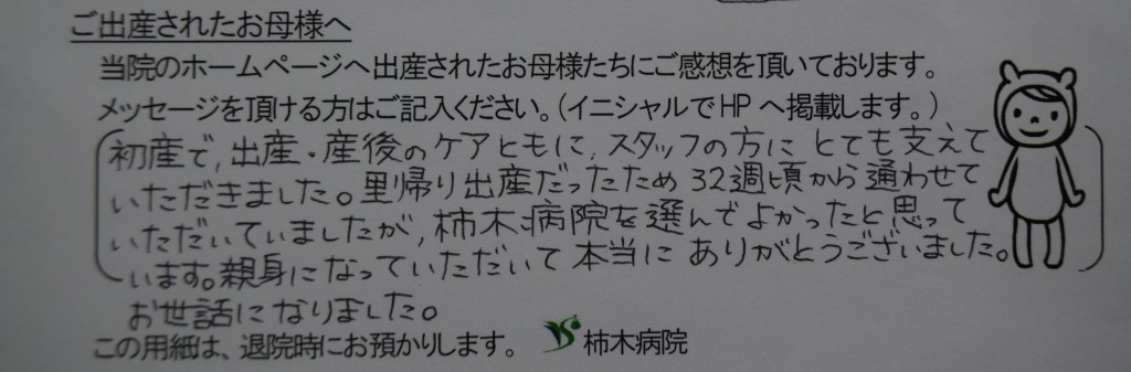 初産で出産・産後のケアともに、スタッフの方にとても支えていただきました。里帰り出産だったため32週頃から通わせていただいていましたが、柿木病院を選んでよかったと思います。親身になっていただいて本当にありがとうございました。お世話になりました。