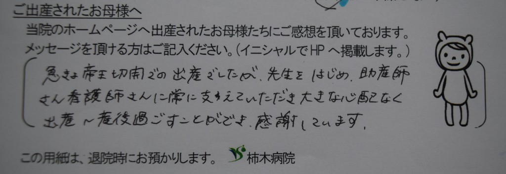 急きょ帝王切開での出産でしたが先生をはじめ、助産師さん看護師さんに常に支えていただき大きな心配なく出産~産後過ごすことができ、感謝しています。