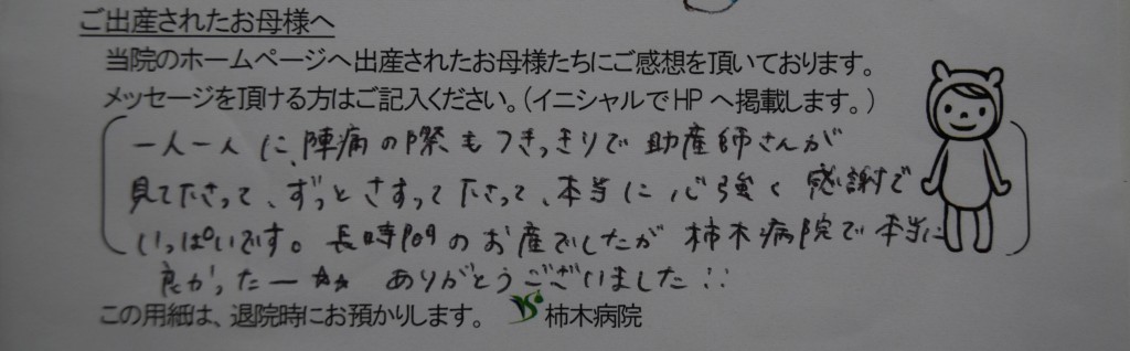 一人一人に陣痛の際もつきっきりで助産師さんが見て下さって、ずっとさすって下さって、本当に心強く感謝でいっぱいです。長時間のお産でしたが、柿木病院で本当に良かったーー☆<br />