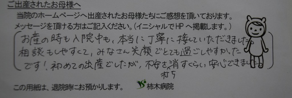 お産の時も入院中も本当に丁寧に接していただきました。相談もしやすくて、みなさん笑顔でとても過ごしやすかったです!初めての出産でしたが、不安を打ち消すくらい安心できました。