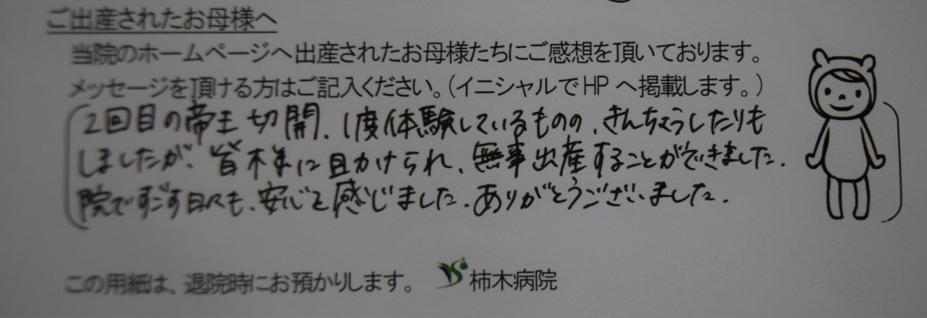 2回目の帝王切開、1度体験しているものの緊張したりもしましたが皆様に助けられ、無事出産することができました。院で過ごす日々も安心を感じました。ありがとうございました。