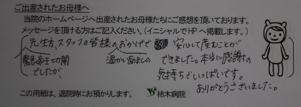 緊急帝王切開でしたが先生方、スタッフの皆様の温かい励ましのおかげで安心して産むことができました。本当に感謝の気持ちでいっぱいです。<br />