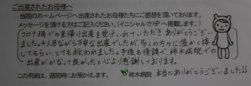 コロナ禍での里帰り出産を受けいれていただき、ありがとうございました。4人目ながら不安な出産でしたが多くの方々に温かく接してもらい、とても救われました。予後も順調で柿木病院での出産がかなって良かったと心より感謝しております。<br />