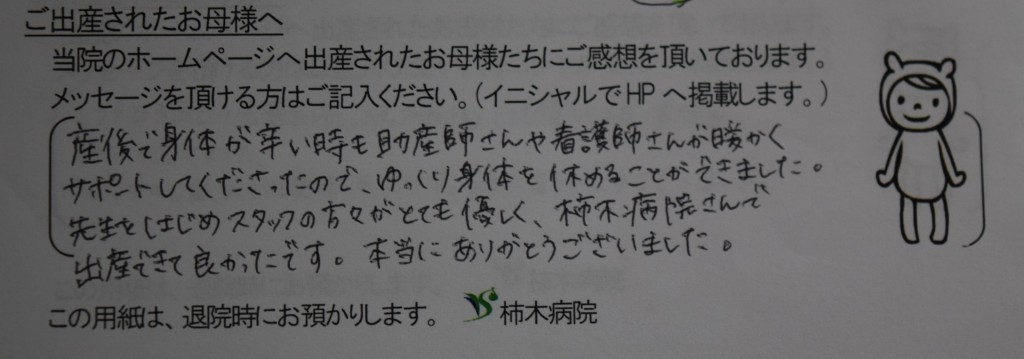 先生をはじめスタッフの方々がとても優しく、柿木病院さんで出産できて良かったです。本当にありがとうございました。