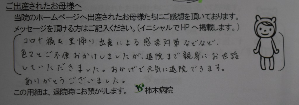 コロナ禍&里帰り出産による感染対策などなど、色々とご不便おかけしましたが退院まで親身にお世話していただきました。おかげで元気に退院できます。<br />