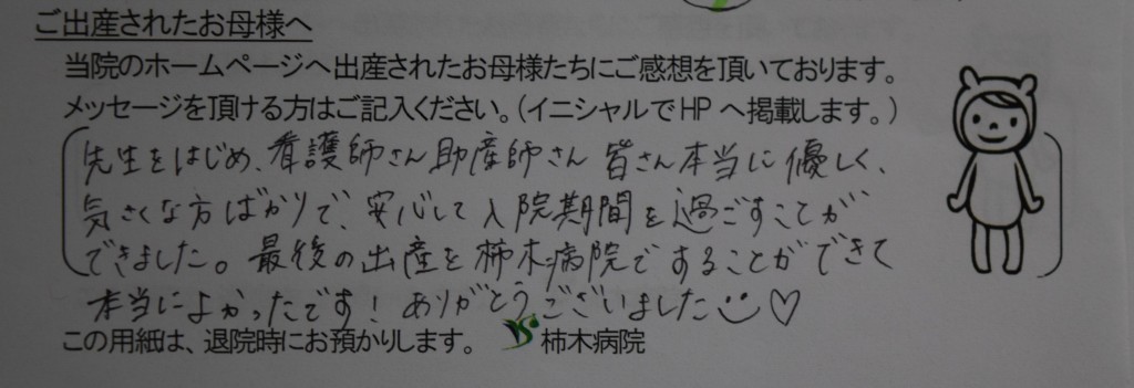 先生をはじめ、看護師さん助産師さん皆さん本当に優しく、気さくな方ばかりで安心して入院期間を過ごすことができました。最後の出産を柿木病院ですることができて本当によかったです!ありがとうございました☻