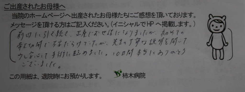 前回に引き続き、出産でお世話になりましたが初めての帝王切開で不安だらけでしたが先生の丁寧な説明を聞いて少し安心して手術に臨めました。10日間本当にありがとうございました。