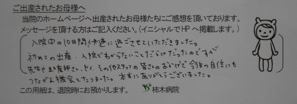 初めての出産・入院でわからないことだらけだったのですが先生や助産師さん、NS. その他スタッフの皆さんのおかげで今後の自信にもつながる機会となりました。本当にありがとうございました。
