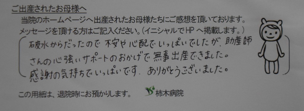 破水からだったので不安や心配でいっぱいでいたが、助産師さんの心強いサポートのおかげで無事出産できました。<br />