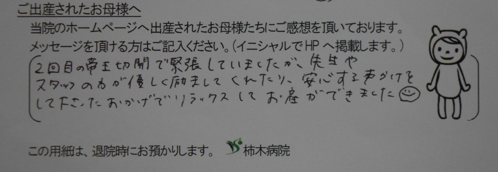 2回目の帝王切開で緊張していましたが、先生やスタッフの方が優しく励ましてくれたり、安心する声かけをして下さったおかげでリラックスしてお産ができました☻