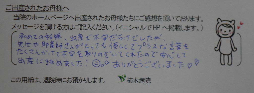 初めての妊娠、出産で不安だらけでしたが先生や助産師さんがとっても優しくてプラスな言葉をたくさんかけて不安を取り除いてくれたので安心して出産に挑めました!☻☆<br />
